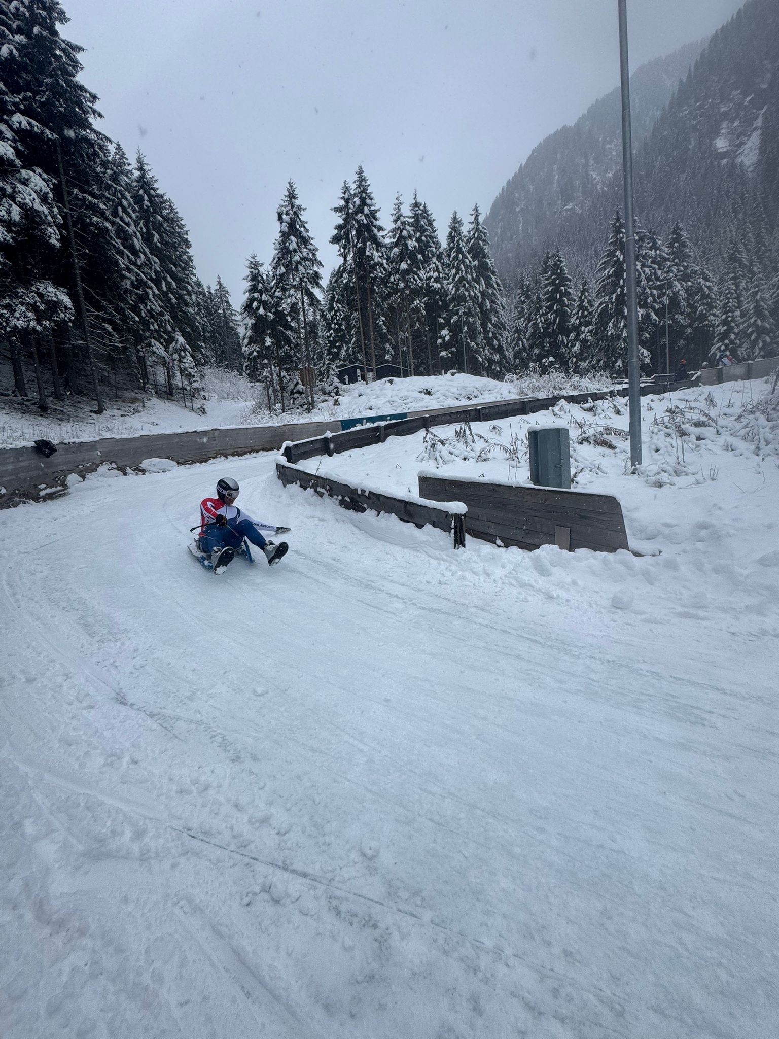 After securing a place on the team’s novice week, he quickly discovered that the sport is far from intuitive. Steering requires a strong core, precise technique and the ability to coordinate multiple movements at once, all while carrying a 14 kg sled back up the track between runs. “It feels like trying to do 10 things at once and your brain scrambles to make it all work”, he said.